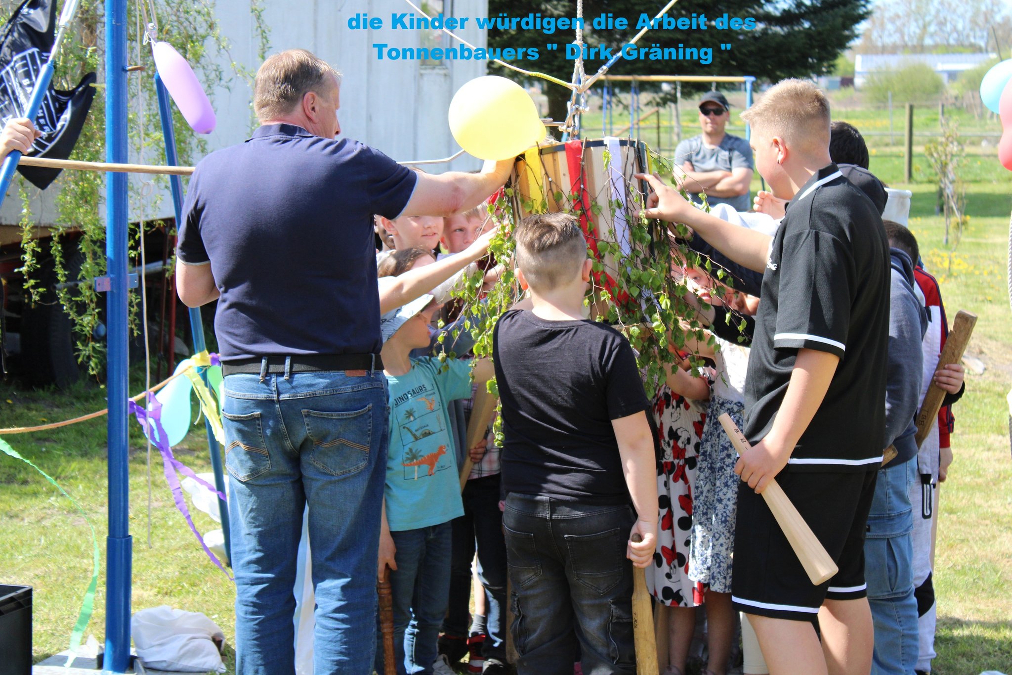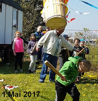 Feuerwehr mit einem Kindertonnenabschlagen beteiligt! Nachdem am Tag der Arbeit dem Tonnenbauer S. Schröder, seiner gutgebauten Tonne gewürdigt wurde und die Kids durch Frank am