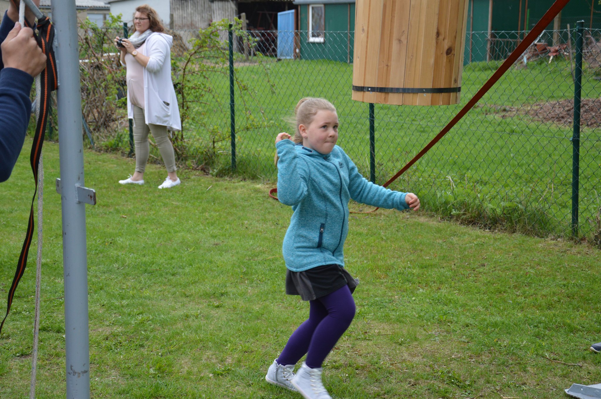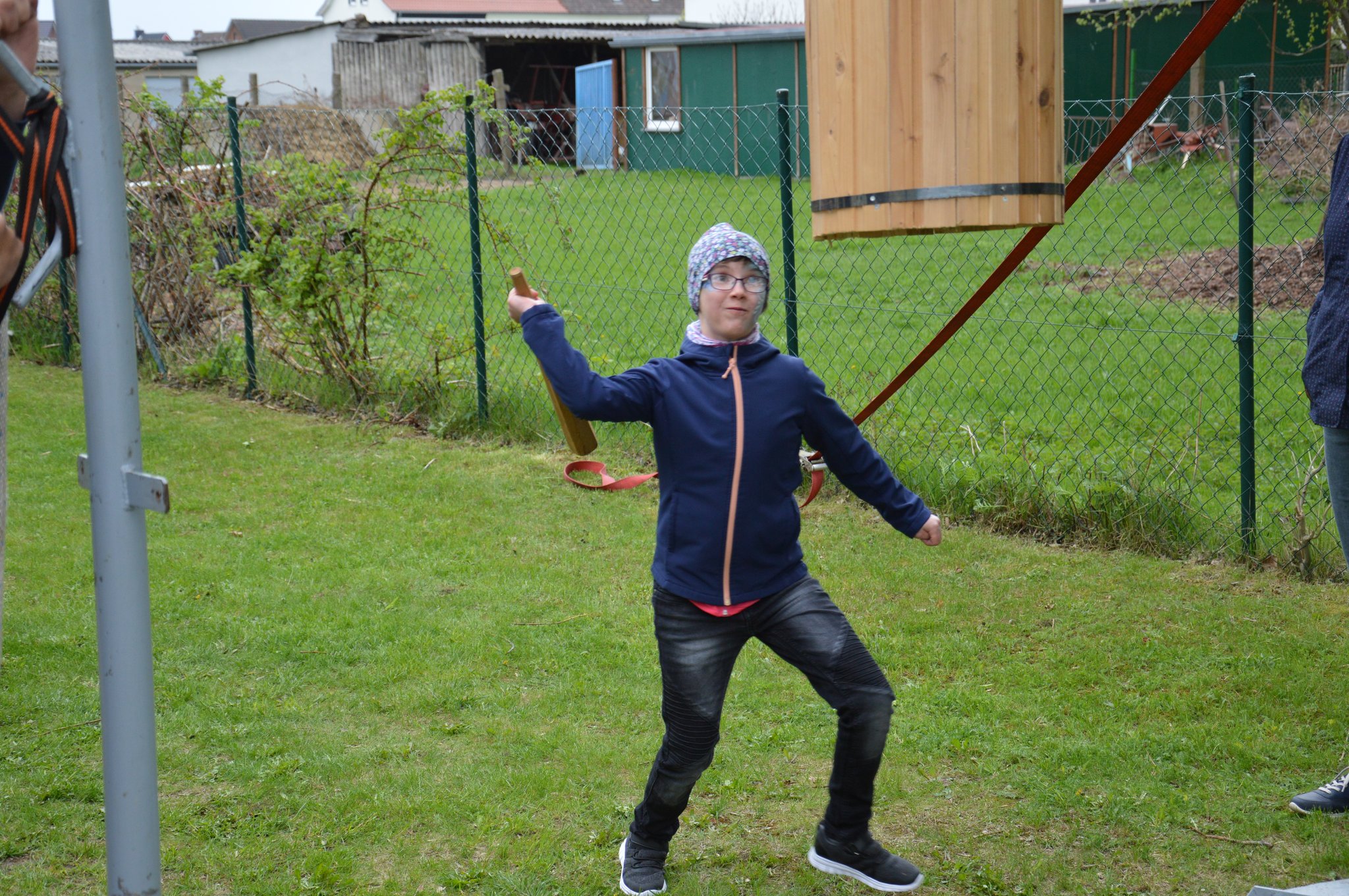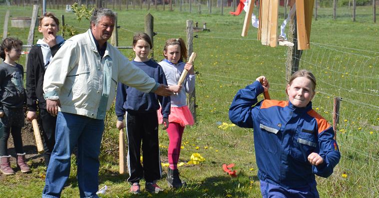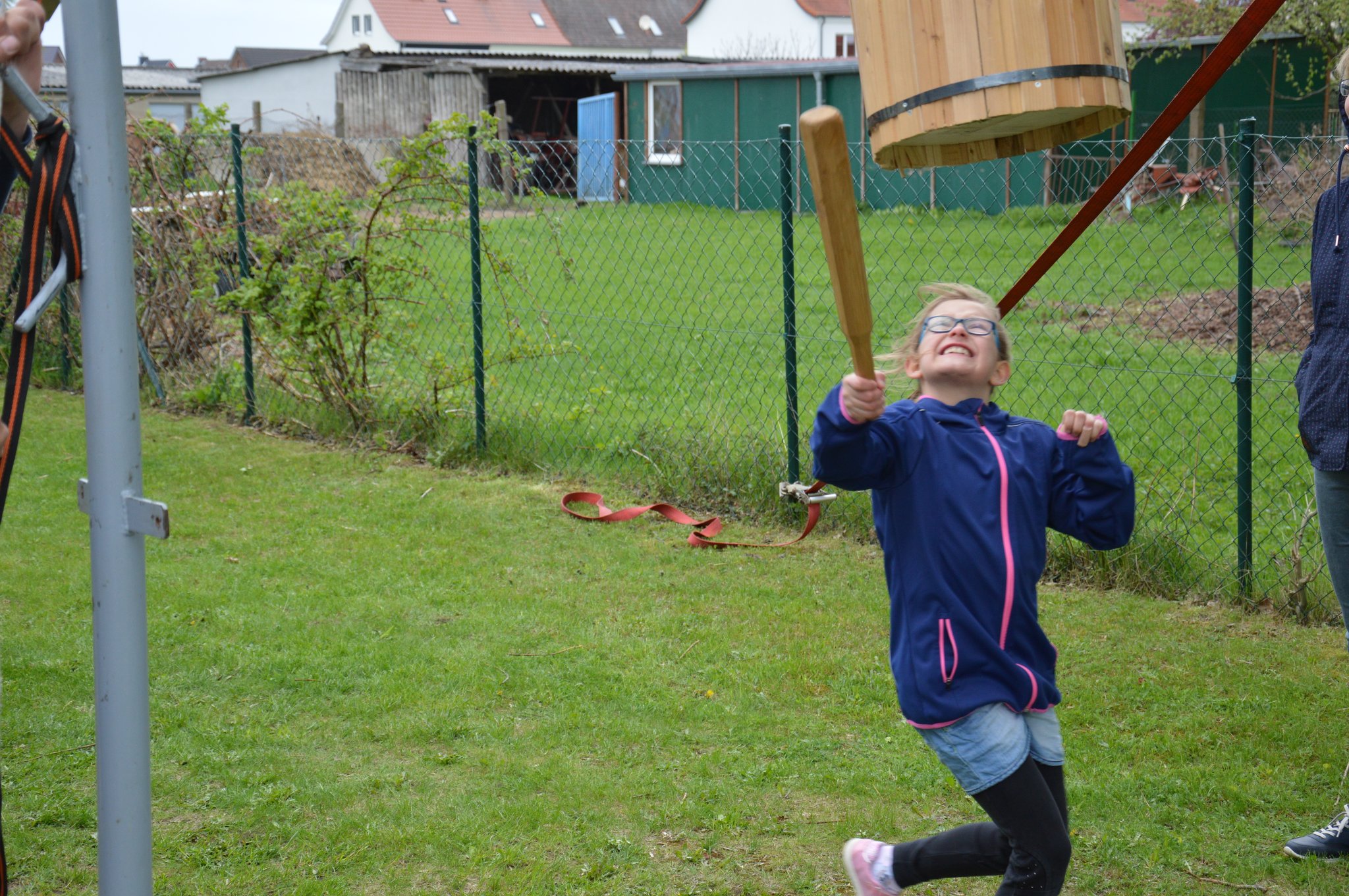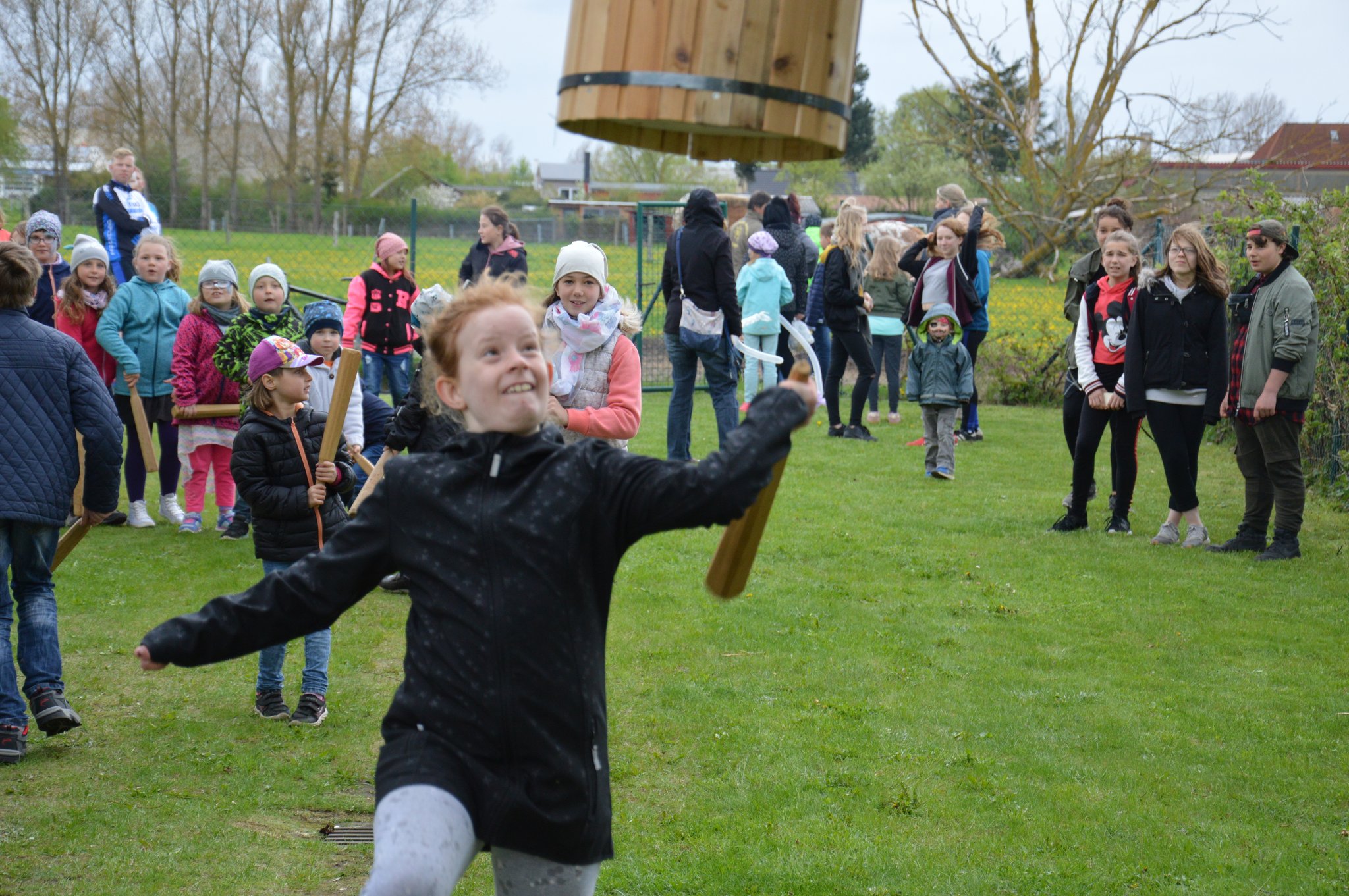 Michelle Klein aus Barth hat der Tonne den Boden rausgehauen und das fast als ganzes Stück, aber alle der 21 beteiligten Kinder haben die vorarbeit geleistet, doch sie war zur richtigen Zeit an der richtigen Stelle mit dem Schlag wo der Boden nicht länger beim der Tonne bleiben konnte!