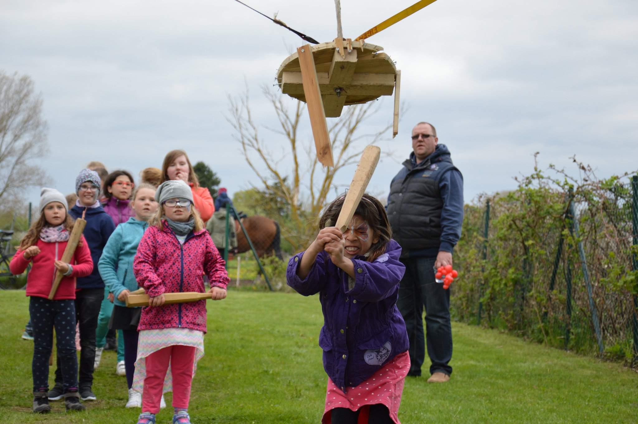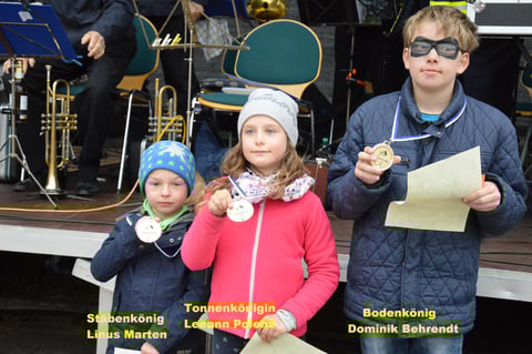 Weit über 20 Kinder hatten sich angemeldet und liesen die Keulen auf die Tonne prasseln, so ging es Runde um Runde zu Fuß unter dem Galgen mit der hängenden Tonne durch und es dauerte nicht lange bis bei den Schlägen das Holz des Bodens nachgab und ein Bodenkönig bejubelt werden konnte.