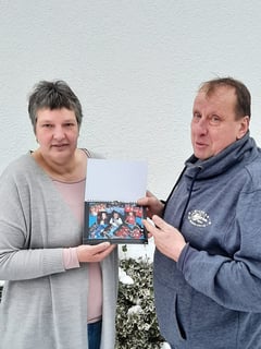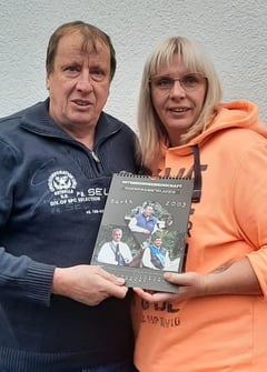 Foto: Frank Olschofski und die Gewinnerin des Kalenders von 2023 Andrea Leuschel.