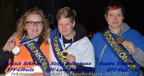 Wiederumnur 8 Minuten dauerte das Schlagen auf die Tonne, als die Tonnenhalter "Udo Haferung und Remo Kloss glaubten die Amts-Stäbenkönigin bekannt geben zu können. Doch es stelte sich herraus das noch etwas von den Stäben am Deckel hing, also weiterschlagen und nach nur zwei Schlägen wurde die Frauen-Amts-Stäbenkönigin 2019 "Dominik Schwarz" gekürt.